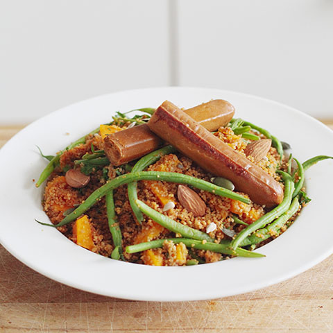 - Ajouter le potimarron, les haricots, la semoule de sarrasin et les saucisses végétales de seitan.