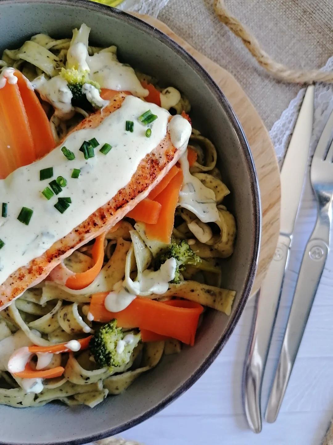 Rubans Ail & Basilic, saumon à la sauce moutarde et citron
